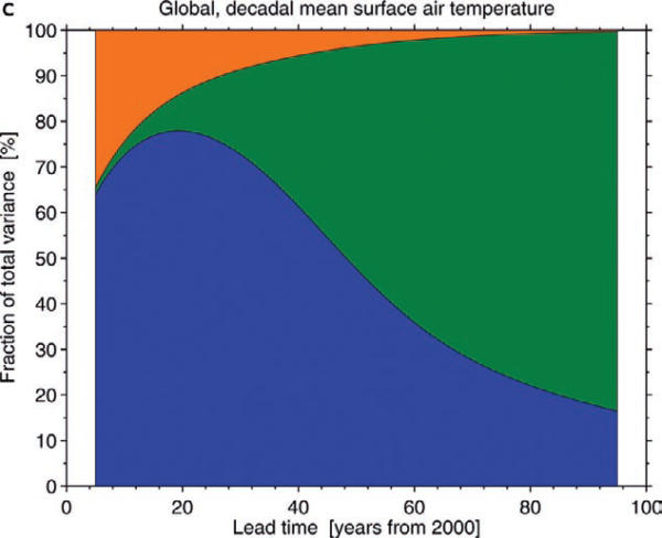 Hawkins et Sutton (2009) montrent que ces différentes incertitudes prennent une part plus ou moins grande dans l’incertitude générale de la prédiction climatique dépendant du court, moyen et long terme.Ainsi, jusqu’à l’horizon 2040-2050, l’incertitude liée aux modèles reste plus grande que l’incertitude liée aux scénarios d’émission de gaz à effet de serre et celle liée au système climatique, tandis que l'incertitude associée aux émissions futures domine à plus long terme (Figure 1).